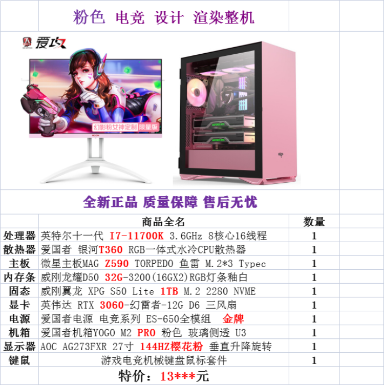 【i7-11700K整机】酷睿i7-11700K/32G内存/1TB固态/12G独显/27寸显示器 粉色电竞设计游戏整机