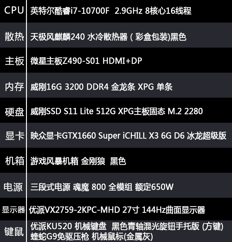 【i7-10700F整机】酷睿i7-10700F/16G内存/512G固态/优派27寸电竞显示器游戏整机云南电脑