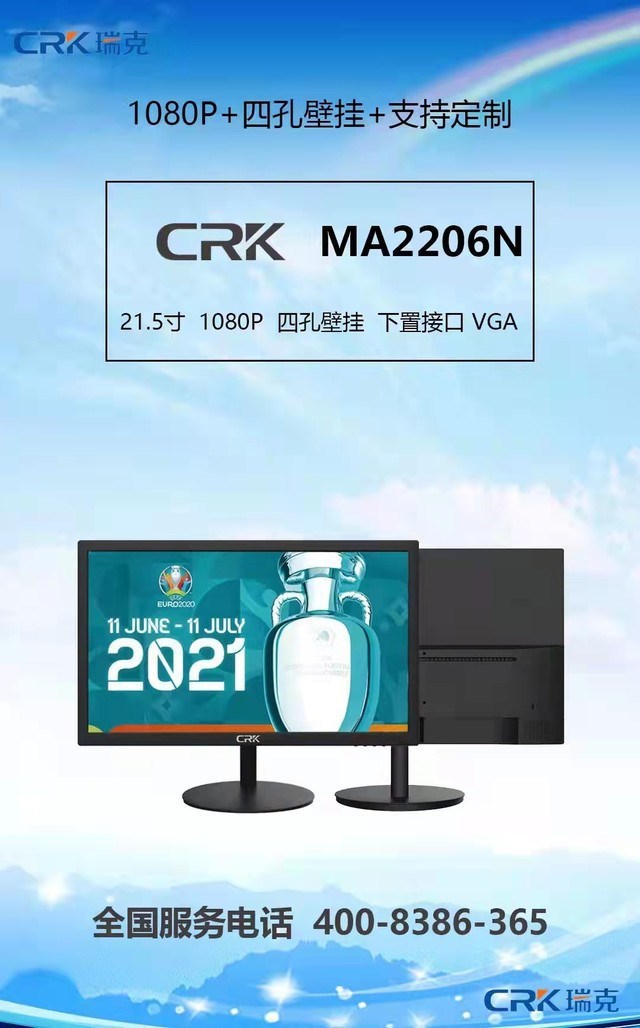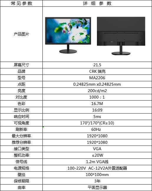瑞克显示器 MA2206N 21.5寸平面 支持壁挂 黑色 VGA